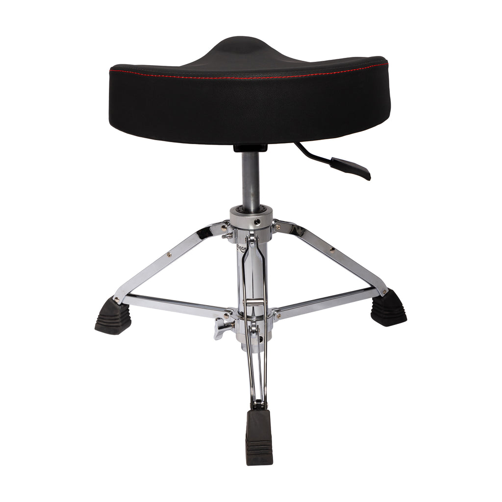 The Kahzan Premium Drum Throne Hydraulic (Chrome) featuring a collapsable double braced leg base, non slip rubber feet, hydaulic height adjustment and a deluxe padded motorbike shaped seat.